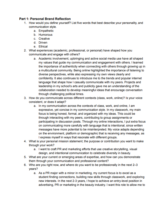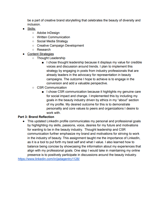 This assignment gave background into my personal brand, inspired by my upbringing and values. I was instructed to create a LinkedIn profile and note other successful aspects of a proper profile.