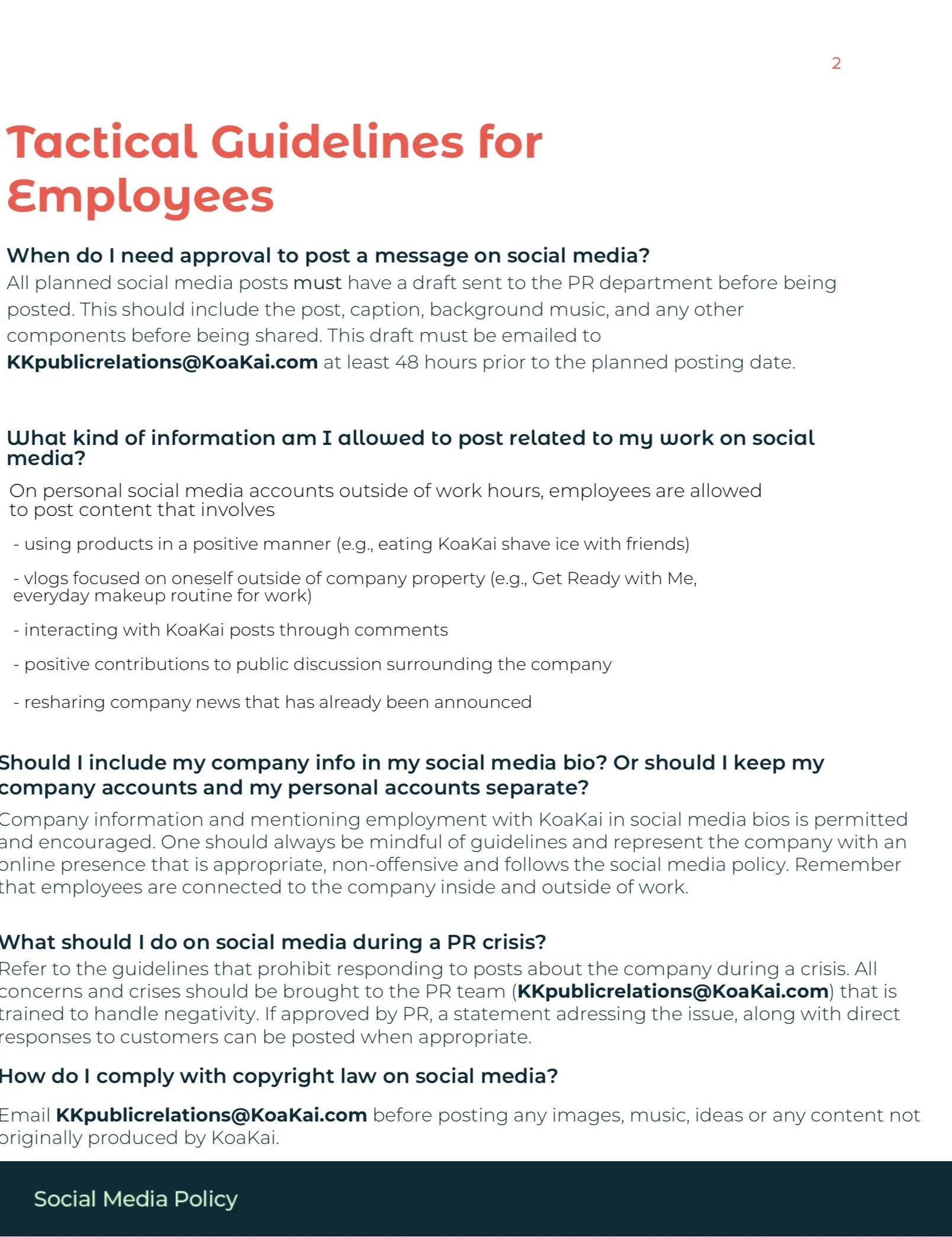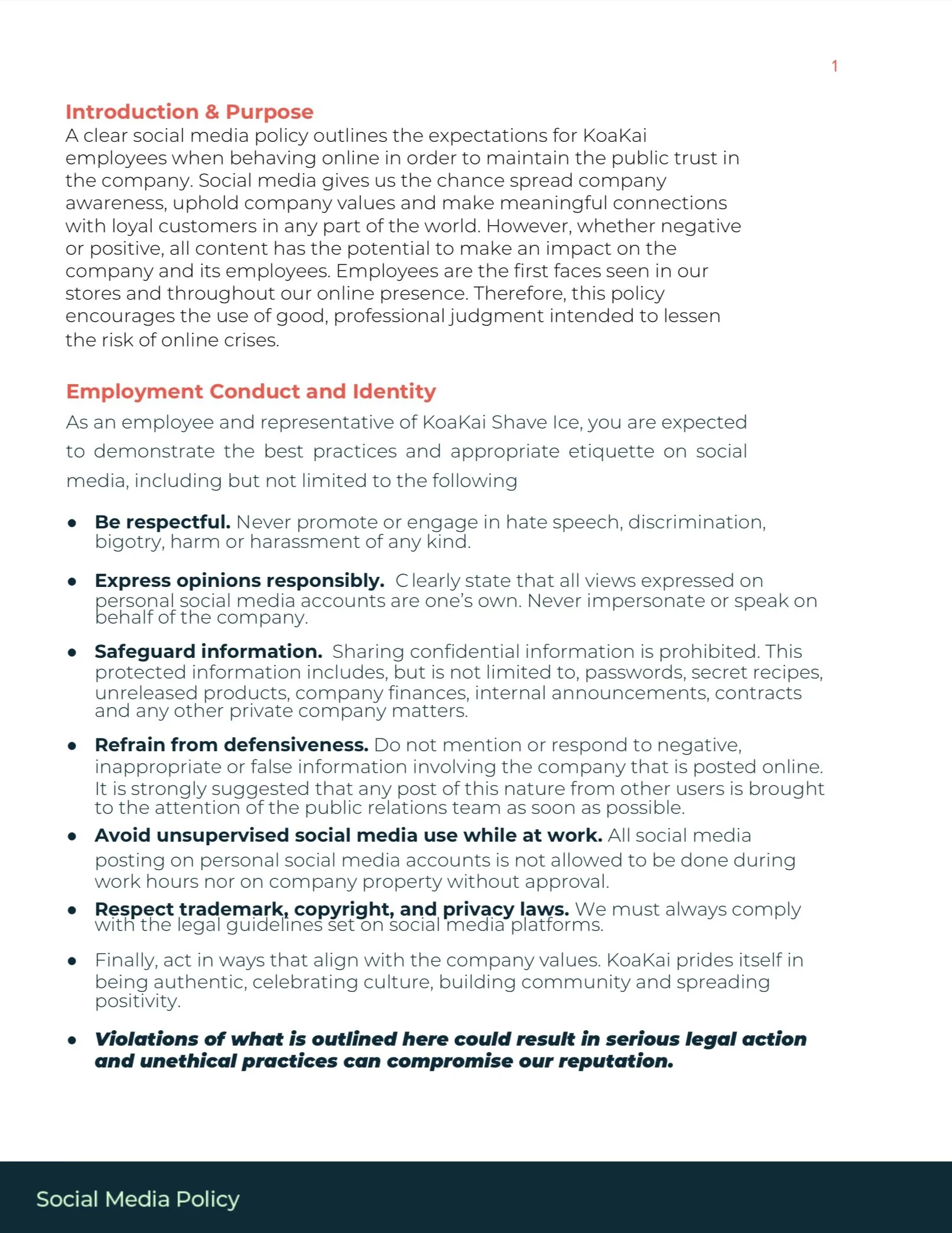 Continuing with Koa Kai Shave Ice, I was assigned to create a social media policy for the company that outlined clear ethical, legal, and professional standards online. It detailed the guidelines for employee engagement in social media, along with the PR professional’s commitment to upholding these behaviors as well.